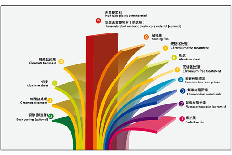 5、按照鋁塑復合板國家標準 GB/T17748-1999生產的氟碳外墻板,涂層采用70%的氟碳樹脂,在正常氣候環(huán)境條